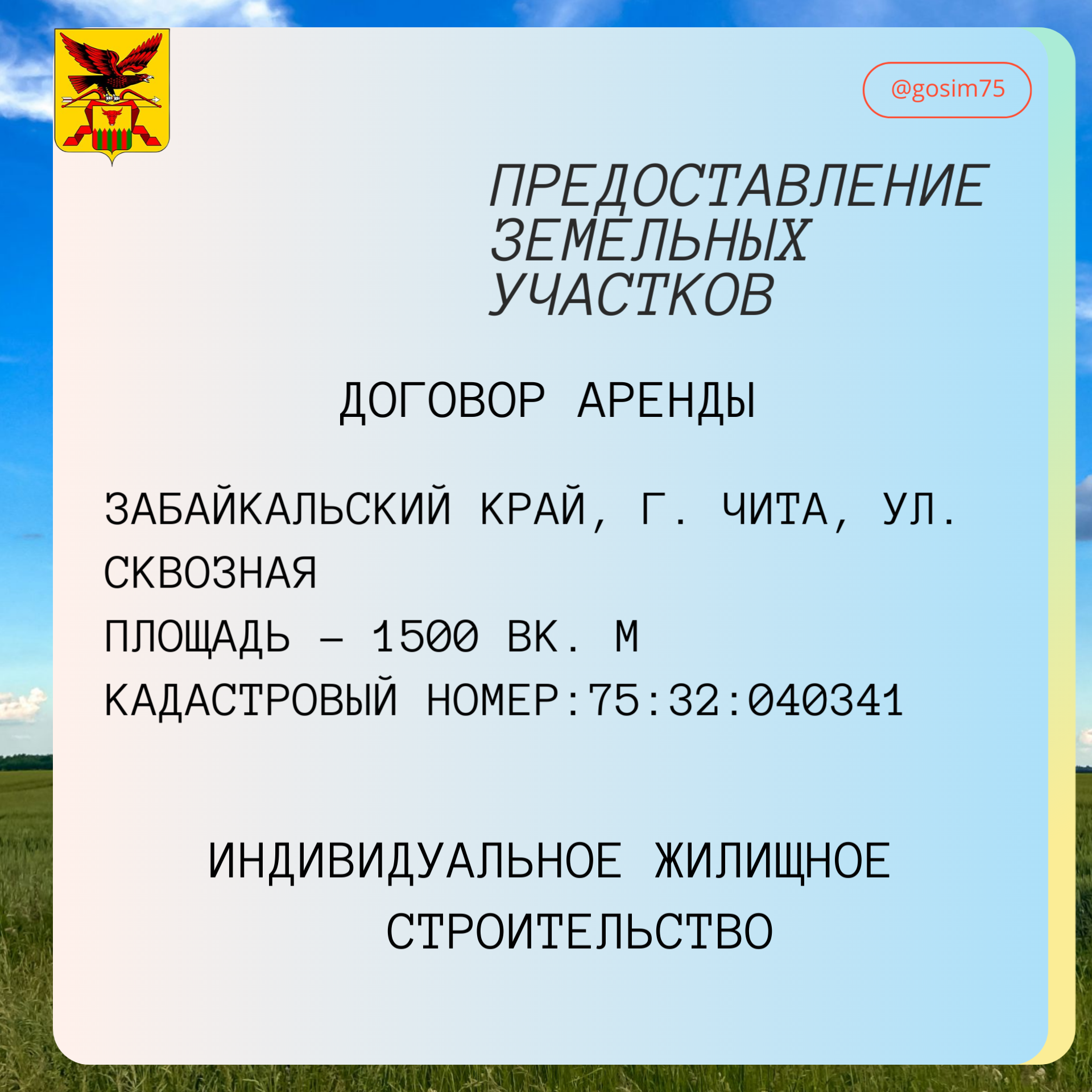Заявления установленной формы принимаются в Департаменте государственного имущества и земельных отношений Забайкальского края по адресу: г. Чита, Амурская ул., 68 (вход с Профсоюзной ул.), 2 окно, в понедельник, вторник с 14-00 до 17-00, среда, четверг, пятница – не приемные дни, суббота, воскресенье – выходные дни. Заявление вправе подать только гражданин.
